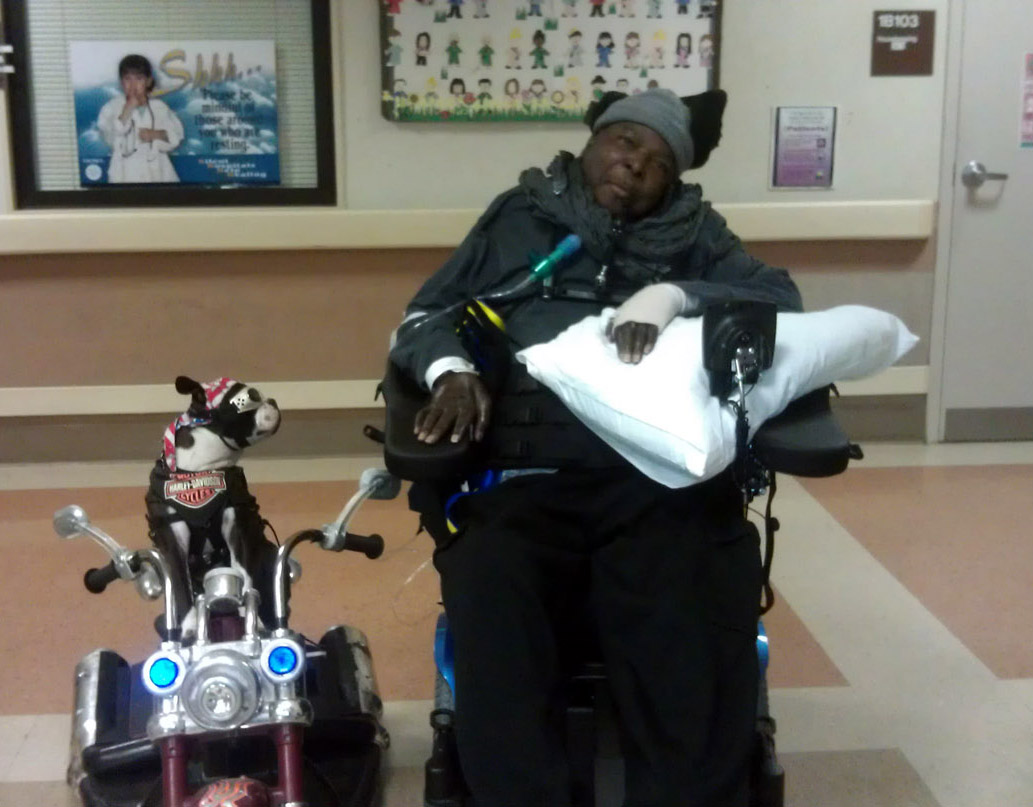 patients there and at CHOC (Children’s Hospital of So when he learned there was a special medical center that treats our veterans, he immediately knew he HAD to go and pay his respects in person. But, he wondered… “They probably don’t even know who I am… Would they allow me in to see the soldiers?” Not certain of how he might be accepted, he decided it was well worth the trip to try to see them. And maybe they might know who he is. After all, Chopper raised money for the “Wounded Warrior Project” of San Diego earlier this year. Chopper (and his human, Mark Shaffer) put those questions and uncertainties behind him and headed for the VA Hospital. After all, these men and women put their lives on the line… the least he could do is to try to visit them and pay his respects. When Chopper and Mark arrived, they were stopped in the lobby by patients and their families who were excited to see a little dog dressed up as a biker on a motorized bike. Many of them wanted to meet Chopper and take his picture. As they looked at the smiles on the faces of all, Chopper and Mark realized the trip was already successful.