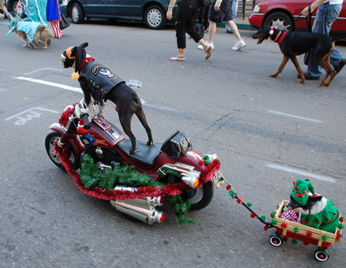 For this year’s Gaslamp parade, Chopper went all out and “accessorized” his Harley with Christmas decorations. But he didn’t stop there. He dressed as “Santa” and towed a little red wagon behind his Harley. And in that wagon sat his buddy “Spike” dressed as an elf. Together, Chopper and Spike took “Best of Show” in a parade San Diego (Chopper) won’t soon forget! (see photos below)