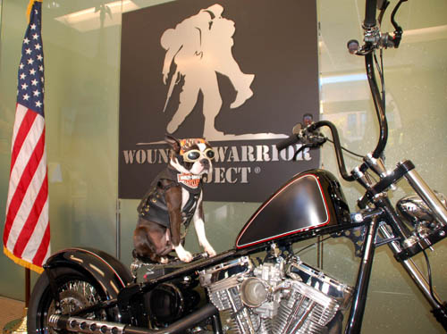 So from May of this year until his 2nd birthday (August 3rd), Chopper decided to donate $1 from the sale of every “Chopper The Biker Dog” Patch to the Wounded Warrior Project. At every appearance during this 3 month period, Chopper made it a point to bring the Wounded Warrior Project to the attention of his fans. And it worked. On the morning of August 3rd, Chopper appeared on KUSI to do a live interview discussing the Wounded Warriors with Marcus O. Barnes, manager of the "Warrior to Work at Wounded Warrior Project". Then, Chopper and his owner, Mark Shaffer, rode over to San Diego Harley Davidson to hook up with riders in the local HOG (Harley Owner’s Group) chapter who proudly escorted him to the Wounded Warriors Office in Liberty Station (the old Naval Training Center Facility).